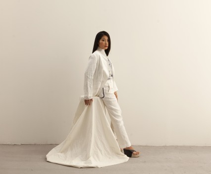 For the first time, the collection includes fabrics designed by Ilana Efrati. The natural landscape and the green panorama of Efrati’s Italian home served as inspiration for a collection of hand-printed textiles, some of which were shown in Efrati’s exhibition at Periscope gallery in 2012. The hand-printed textiles were then scanned, and digitally printed on silk cloth, becoming the centerpiece of the new collection 2013. The new collection is based on minimalist cuts, exploring the tensions between sleek and dry materials.